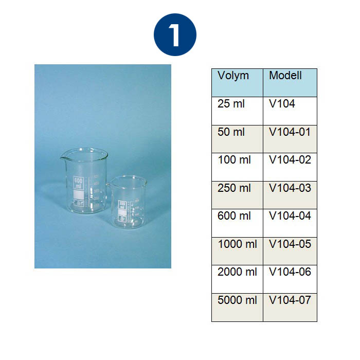 1) Glasbägare med olika volymer mellan 25-5000ml